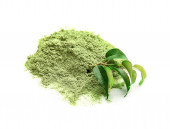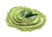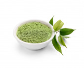 Miska z sproszkowanej herbaty matcha i świeżych liści na białym tle