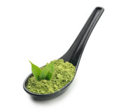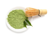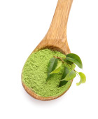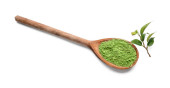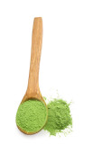 Łyżka z sproszkowanej herbaty matcha i świeżych liści na białym tle
