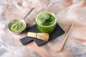 Miska z sproszkowaną herbatą matcha i łyżką na tle koloru