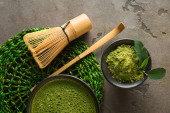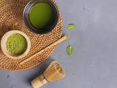 Miska z sproszkowaną herbatą matcha, czajniczek i chasen na jasnym tle