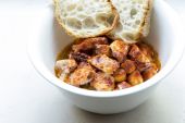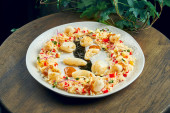 Pyszne azjatyckie jedzenie uliczne - słodki i kwaśny kurczak z nasionami sezamu i papryką w białej misce na drewnianym tle.