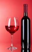 butelka czerwonego wina i wypełniony z tego samego poziomu kieliszek do wina na czerwonym tle