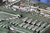 niebieski plastik Przybornik podparte otwarte z Piły i inne narzędzia widoczne.