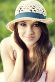 portret to piękna młoda kobieta z brunetką w kratki retro sukienka. dziewczyna pozuje w przyrodzie z mały bukiet fiołek