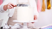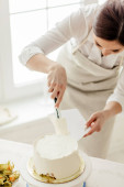 Piękne skoncentrowane ciasto kucharz kobieta robi ciasto z kremem w przytulnej kuchni
