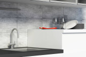 Metalowy piec gazowy ze stali nierdzewnej montowany na kuchni z ciemnoszarym blatem.
