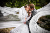 Piękne nowożeńcy przytulanie na tle kwiatów i zielony łuk z lampami i świecami w nocy. Portret ślubny stylowego pana młodego i panny młodej na tle ślubnej strefy fotograficznej. Hałas filmu.
