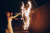 Portret ślubny sylwetki kochanków nowożeńców na tle palącego serca. Pan młody przytula pannę młodą przy ognisku. Płonąca miłość, pokaz pirotechniczny. Panna młoda i pan młody w pokazie ognia