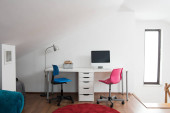 Zdjęcie "Proste drewniane biurko dla dwojga przy łóżku z niebieską pościelą w sypialni z białą cegłą na ścianie" może być wykorzystywane do celów osobistych i komercyjnych zgodnie z warunkami zakupionej licencji Royalty-free. Obraz jest dostępny do pobrania w jakości wysokiej rozdzielczości do 5760x3840.