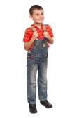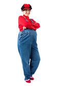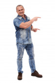 Szczęśliwy biznesmen z rękami w kieszeni, odizolowany na białym tle