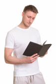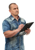 Biznesmen piszący na tablicy, odizolowany na białym tle