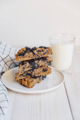 Stos świeżo upieczonych bułeczek owsianych na białym talerzu. Słodkie jedzenie z naturalnych składników. Wegańskie ciasto bezglutenowe.