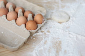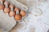 matka i córka w kuchni przygotowują jedzenie z mąki i rysują serca na mące