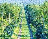 Rzędy plantacji kawy, brazylijska kawa mineiro uprawiana w stanie Minas Gerais. Obszar wiejski regionu Sao Roque de Minas.