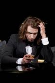 wysoki kąt widzenia elegancki mężczyzna w garniturze siedzi na czarnej skórzanej kanapie ze szklanką whisky