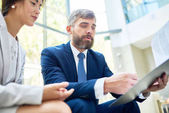 Zamknij ludzi biznesu za pomocą tabletu cyfrowego w biurze. Dwie mieszane rasy biznesmeni omawiają strategię biznesową w budynku biurowym przy użyciu tabletu cyfrowego