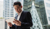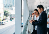 Zdjęcie "Szczęśliwi współpracownicy biznesowi stojący w nowoczesnym korytarzu i patrzący razem na tablet. Biznesmen i bizneswoman stojąca i dyskutująca o strategii biznesowej w korytarzu biurowym i korzystająca z tabletu cyfrowego do pracy" może być wykorzystywane do celów osobistych i komercyjnych zgodnie z warunkami zakupionej licencji Royalty-free. Obraz jest dostępny do pobrania w jakości wysokiej rozdzielczości do 5760x3840.