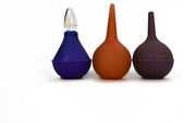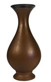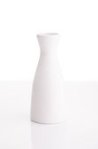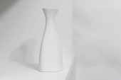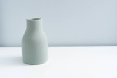 Jedna biała waza na białym stole. W tle jest jasne mleczne tło.