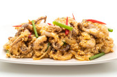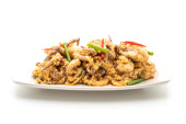 Odizolowana krewetka tygrysa smażona z czarnym pieprzem. Owoce morza tajskie kuchnia świeże pyszne i pikantne na białym tle.