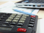 Kalkulator, pióra, folder dokumenty, laptopa