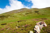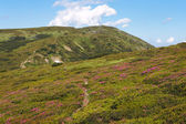 Różanecznik różowy kwiaty i małe jedynie na zboczu góry lato z chmury na szczycie wzgórza (Ukraina, Karpaty)
