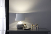 Szara komoda z wystrojem i książkami przy białej ceglanej ścianie. Projekt wnętrza
