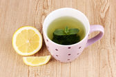 Filiżanka herbaty z aromatycznych suchej herbaty w kręgle drewniane tła