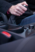 mężczyzna ręka gra do samolotu strzelanka z joystick na czarnym tle.