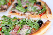 kawałek pizzy z rukolą na deski do krojenia, drewniane kolor tła