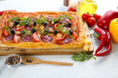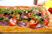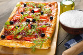 kawałek pizzy z rukolą na deski do krojenia, drewniane kolor tła