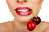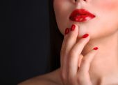 meisje met rode lippen, nagels en aardbeien op donkere achtergrond