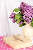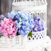 Kompozycja z kubki do herbaty i piękne wiosenne kwiaty w wazonie, na drewnianym stole, na jasnym tle