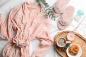 Jeansy, różowy szalik, dzbanek do herbaty i szklanki na białym jasnym, teksturowanym tle.