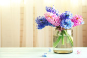 piękne wiosenne kwiaty w szklanych butelkach, na drewnianym stole, na jasnym tle