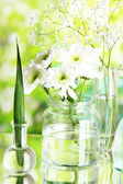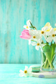 piękne wiosenne kwiaty w szklanych butelkach, na drewnianym stole, na jasnym tle