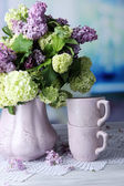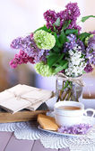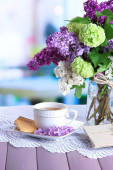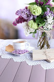 Skład z kubkiem herbaty, stare listy i piękne wiosenne kwiaty w wazonie, na drewnianym stole, na jasnym tle