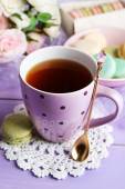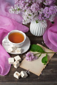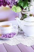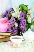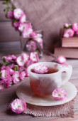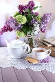 Kompozycja z czajnik, kubek i piękne wiosenne kwiaty w wazonie, na drewnianym stole, na jasnym tle