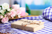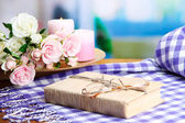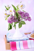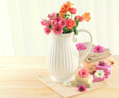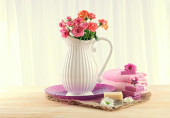 Kompozycja z czajnik, kubek i piękne wiosenne kwiaty w wazonie, na drewnianym stole, na jasnym tle