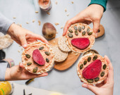 Zdjęcie "Chrupiące ciasta ryżowe na stole z hummusem rozsypać szpinak z jajkami i pomidorami i warzywami na stole - widok z góry na zdrowe wegetariańskie śniadanie bezglutenowe" może być wykorzystywane do celów osobistych i komercyjnych zgodnie z warunkami zakupionej licencji Royalty-free. Obraz jest dostępny do pobrania w jakości wysokiej rozdzielczości do 5760x3840.