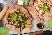 Chrupiące ciasta ryżowe na stole z hummusem rozsypać szpinak z jajkami i pomidorami i warzywami na stole - widok z góry na zdrowe wegetariańskie śniadanie bezglutenowe