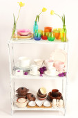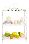 różne naczynia na półce, na białym tle