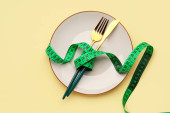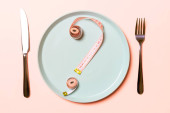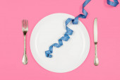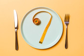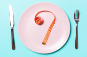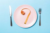 Zdjęcie "Nóż, widelec i taśma pomiarowa na pustym talerzu. Koncepcja diety na niebieskim tle z przestrzenią do kopiowania. Skład płaski" może być wykorzystywane do celów osobistych i komercyjnych zgodnie z warunkami zakupionej licencji Royalty-free. Obraz jest dostępny do pobrania w jakości wysokiej rozdzielczości do 5760x3840.