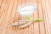 Mleko owsiane w białym dzbanku i płatki owsiane w filiżance na drewnianym stole