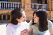 Dwie azjatyckie kobiety trzymające w rękach kryptowalutę. Jedna z Azjatek daje monetę innej Azjatce. Kryptowaluta jest na pierwszym planie.