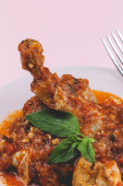 Domowej roboty gulasz z kurczaka piwnego z warzywami i aromatycznymi ziołami z góry.Flat lay