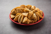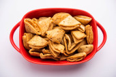 Indian Namkeen palak lub Methi Mathri kształt trójkąta lub Tikona - solone kozieradki lub liści szpinaku mieszane Krakersy