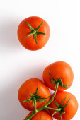 Pomidory na gałęzi z kroplami wody, zbliżenie na białym stole, przestrzeń do kopiowania, szablon