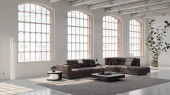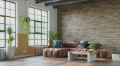 Grungy wnętrze z szorstkimi ceglanymi ścianami i wygodną sofą, w stylu przemysłowym, 3d renderowania
