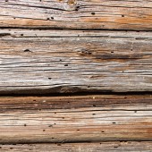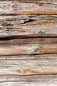 Ściana starego drewnianego domu zbudowanego z okrągłych sosen. Dzienniki są zgniłe i kruche. W ścianie widać dziurę..