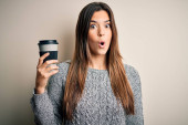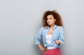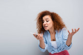 zdezorientowana kobieta patrząc na papierową filiżankę podczas rozmowy na telefon komórkowy odizolowany na szary